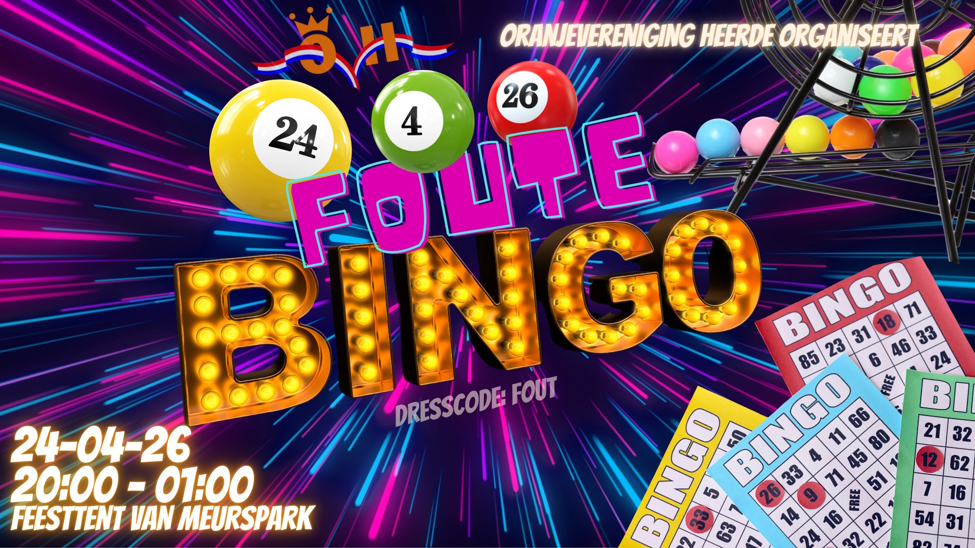 BINGOOOOO!!! Zodra deze valt; handjes in de lucht, voetjes van de vloer en keihard meezingen met liedjes van toen en nu! Dit zijn na het succes van vorig jaar, ook nu weer de belangrijkste ingrediΓ«nten van het Foute Bingo feest in Heerde.